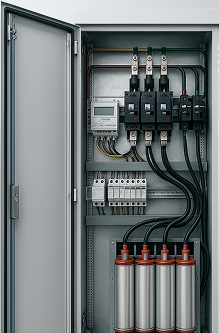 Dostarczamy gotowe szafy kompensacyjne (baterie kondensatorów lub dławików), które automatycznie „zerują” pobór mocy biernej z sieci.